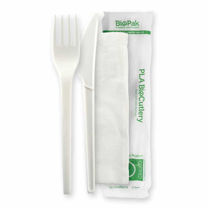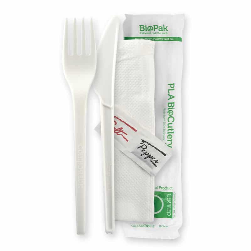 BioPak 100% BioPlastic PLA Cutlery Sets are made from Revode bioplastic – produced from a rapidly renewable starch sourced from non-GMO crops – and is certified commercially compostable. These Sets include; 6.5″ PLA Knife, Fork, Napkin and Optional Salt & Pepper Sachet.
