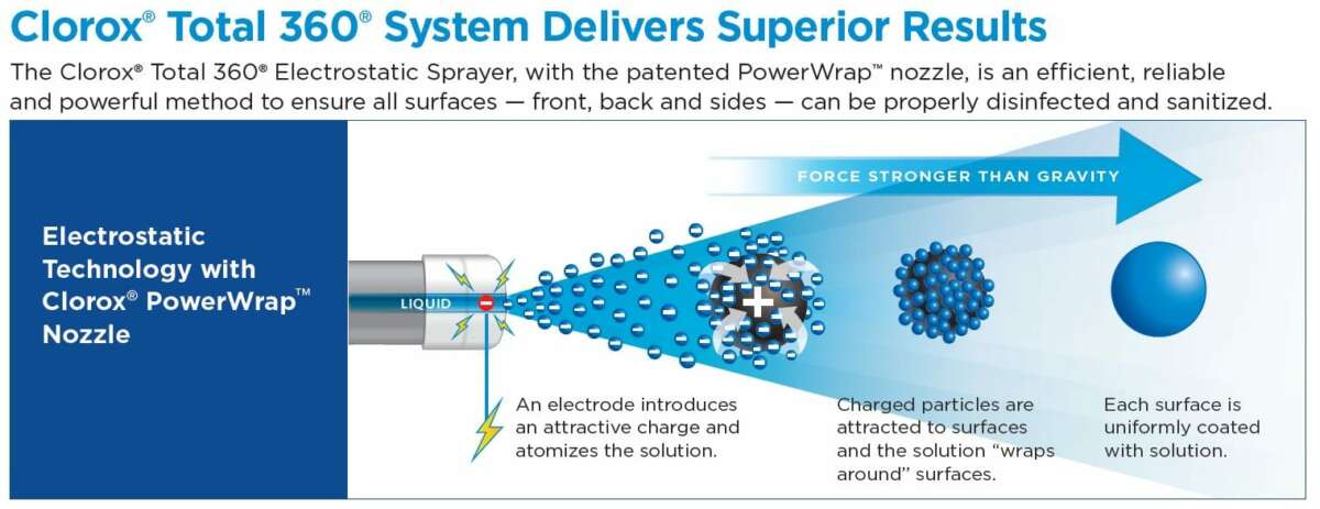 Keep your facility healthier while saving time, money and labour. The innovative electrostatic sprayer, with the patented PowerWrap™ nozzle, delivers trusted Clorox solutions to the front, back and sides of surfaces. Superior coverage for better germ protection.