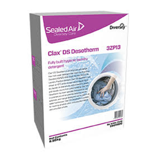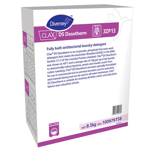 | Clax DS Desotherm | One shot enzymatic, antibacterial detergent that kills >99.9% of germs and meets Australian Standard AS/NZS 4146-2000, Section 3.5.3 of the Laundry Practice. Suitable for top and front loader machines. |
