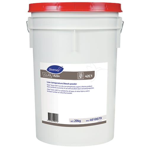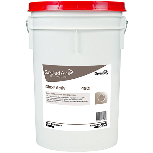 | Clax Activ | Dry, non phosphated, organic chlorine product that combines economy of use with excellent stain removal properties. Suitable for all types of white fabrics and a limited number of colourfast textiles. |