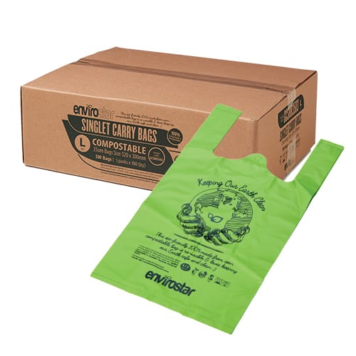 Envirostar Compostable Singlet Bags are made from Compostable material and printed with approved eco-friendly inks making them the best alternative to traditional plastic bags.