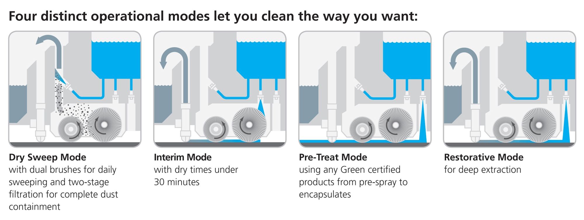- Dry Sweep Mode with vacuum suction, dust misting and two-stage filtration. Dust misting captures dust and eliminates the need for dust bags. Dry Sweep up to 3,250 sq. metres per hour