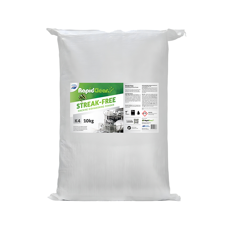 Streak Free is a machine dishwashing powder with built-in rinse additive, is an oxygen activated detergent powder containing sanitising and anti-bacterial properties for commercial and domestic-style dishwashers.