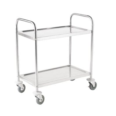 Built from a heavy duty stainless steel, this two tier trolley from Vogue has he strength to withstand constant in busy environments, from catering to hospitality. The large wheels glide over uneven surfaces, such as tiled floors, making it easy to transport around any venue, delivering food, drinks, book, desserts and more. Easy to clean for effortless hygiene, the trolley is perfect for any restaurants, hotel, hospital and more. Material: Stainless steel.
