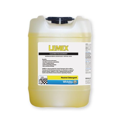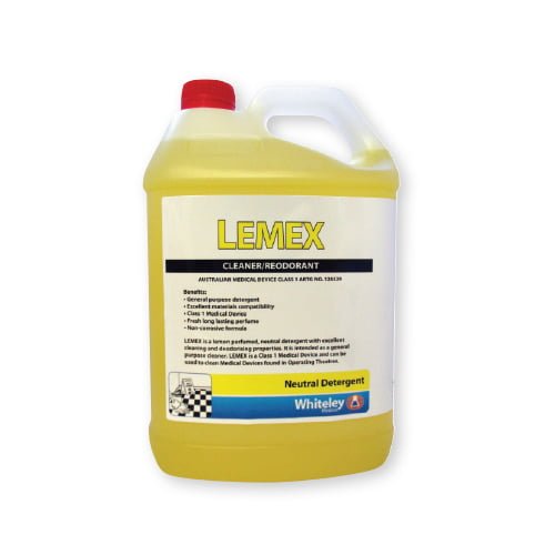 Whiteley Lemex Neutral Detergent is an inexpensive lemon perfumed liquid suitable for general use as a cleaner or deodorant. Lemex is suitable for surface cleaning and use on other Class 1 Medical Devices and has been entered onto the Australian Register of Therapeutic Goods (ARTG). Using Lemex as directed ensures Healthcare facilities comply with current healthcare regulations.